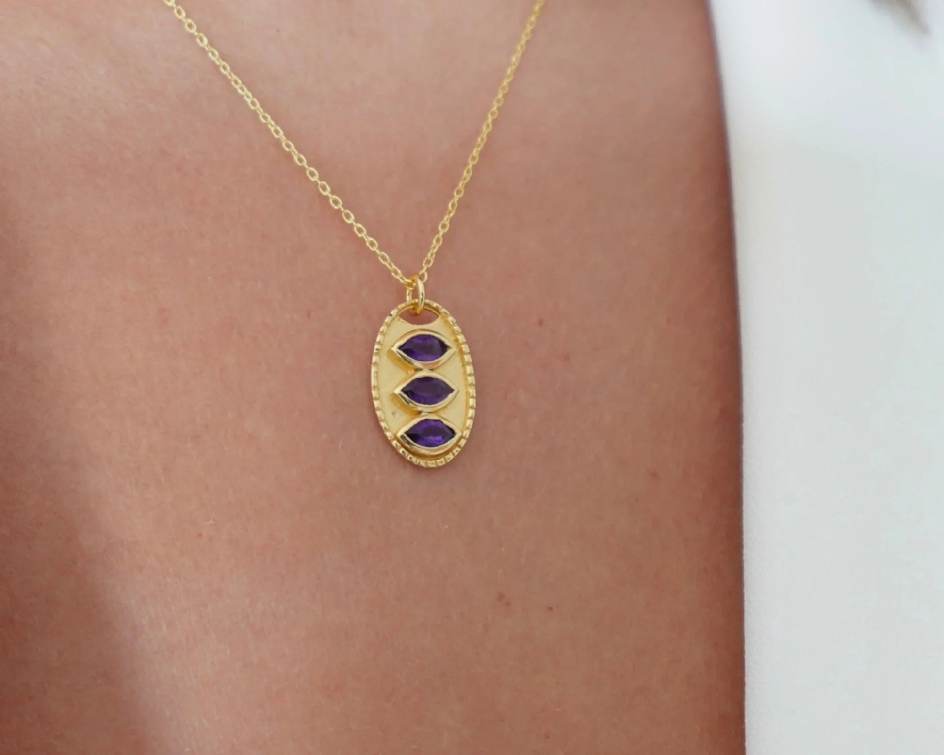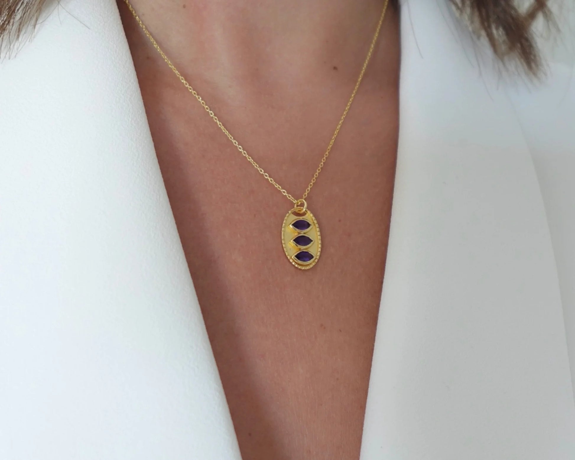 Colgante en plata 925 con baño de oro de 18k y trilogía ovalada en piedra amatista. Longitud: cierre ajustable de 38 a 38 + 3 + 3 cm. Cierre: mosquetón. Grosor cadena: 1mm. Mineral: 5x3mm.