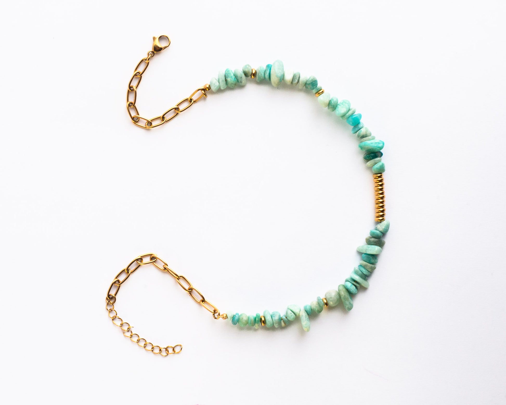 Collar de acero con baño en oro y piedra amazonita de 38 cm con alargador de 5 cm.