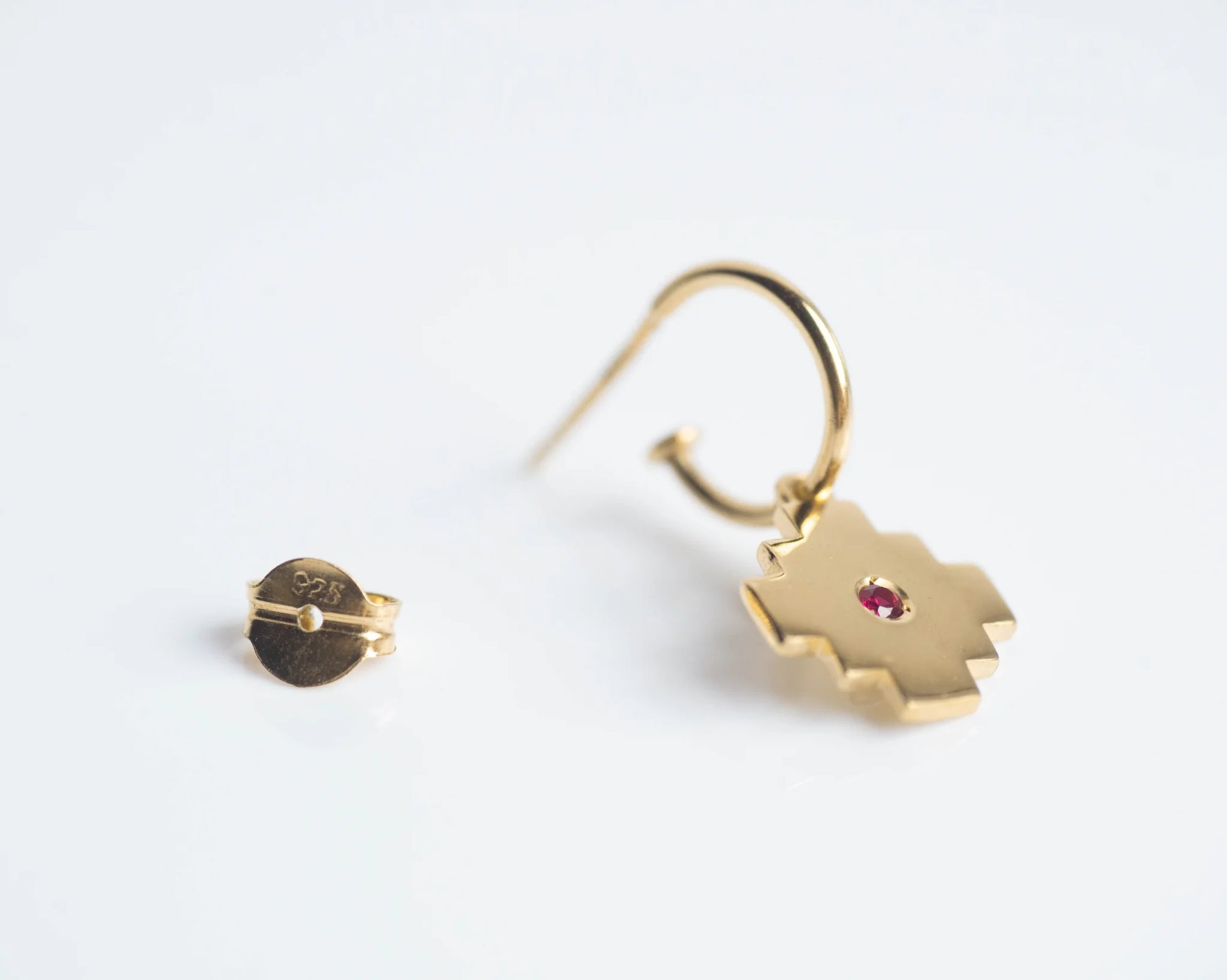 Pendientes: Plata 925 chapada en oro de 18k y circonitas talla brillante de color rojo rubí. Dimensiones: 1. Aro: 12mm. 2. Cruz: 12mm.