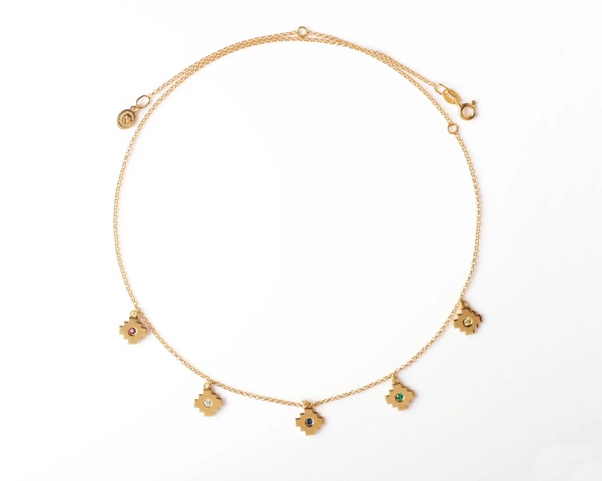 Cadena: Plata 925 chapada en oro de 18k y circonitas talla brillante de color rojo rubí, blanco, azul, verde esmeralda y citrino. Cadena con dos enganches. Dimensiones: cruz 8mm.