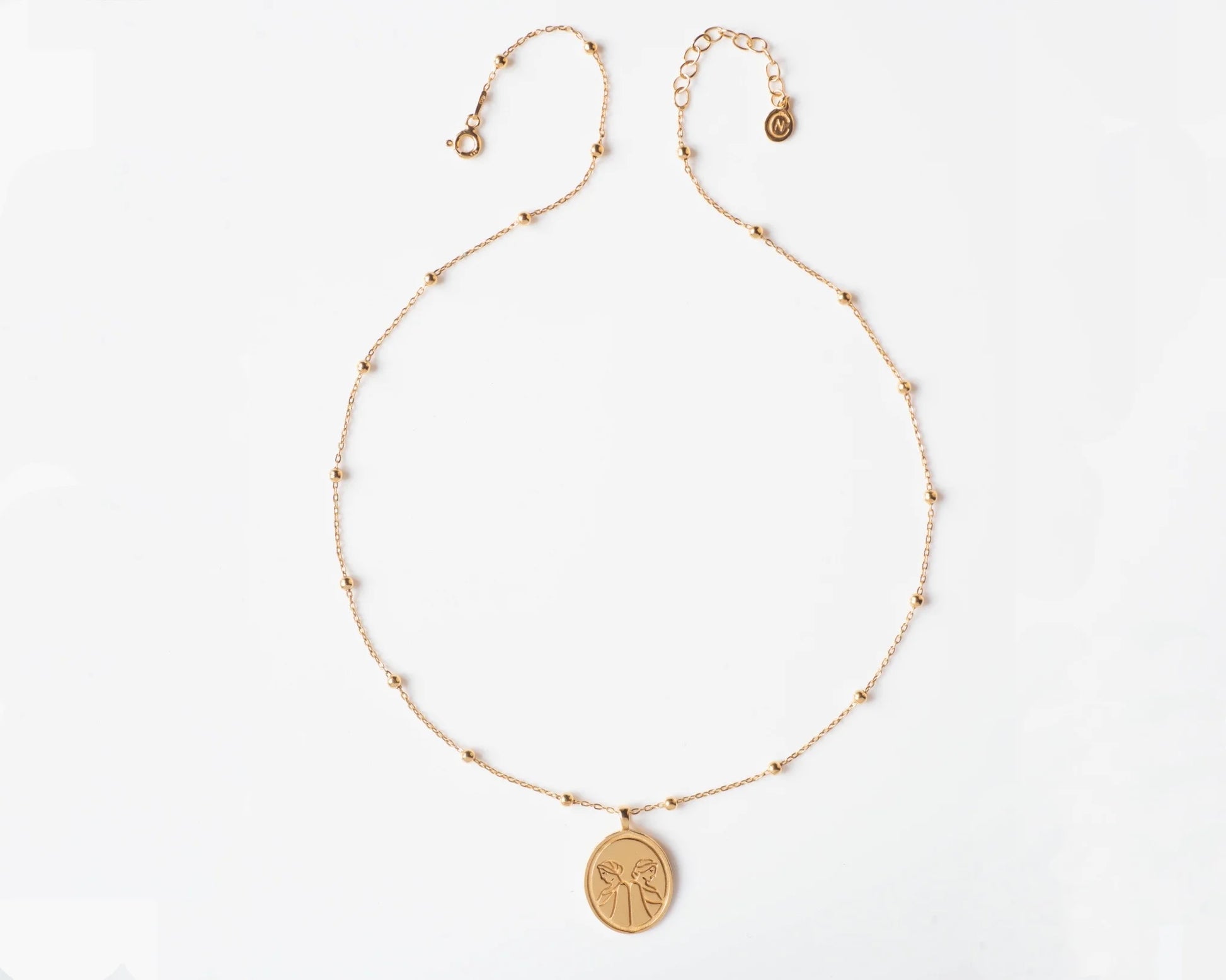 Colgante: Plata 925 chapada en oro de 18k y medallón con logo Noi Clíope en láser. Dimensiones: 1. Cadena de 40cm y alargador de 5cm. 2. Medallón de 20mm x 16mm.