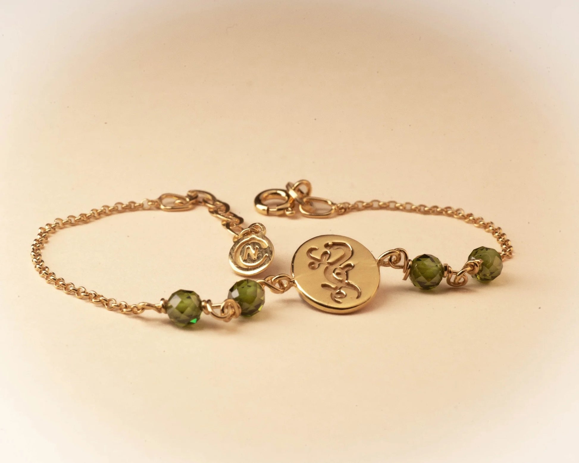 Pulsera: Plata 925 chapada en oro de 18k y circonitas facetadas en color verde olivina. Dimensiones: largo de la pulsera 17cm y alargador de 3cm. Medalla de 10mm x 12mm.