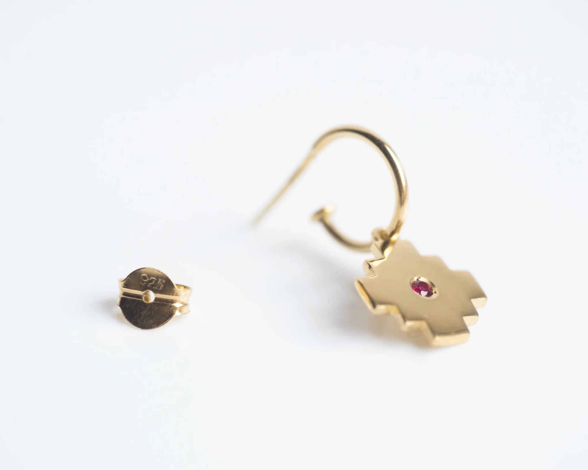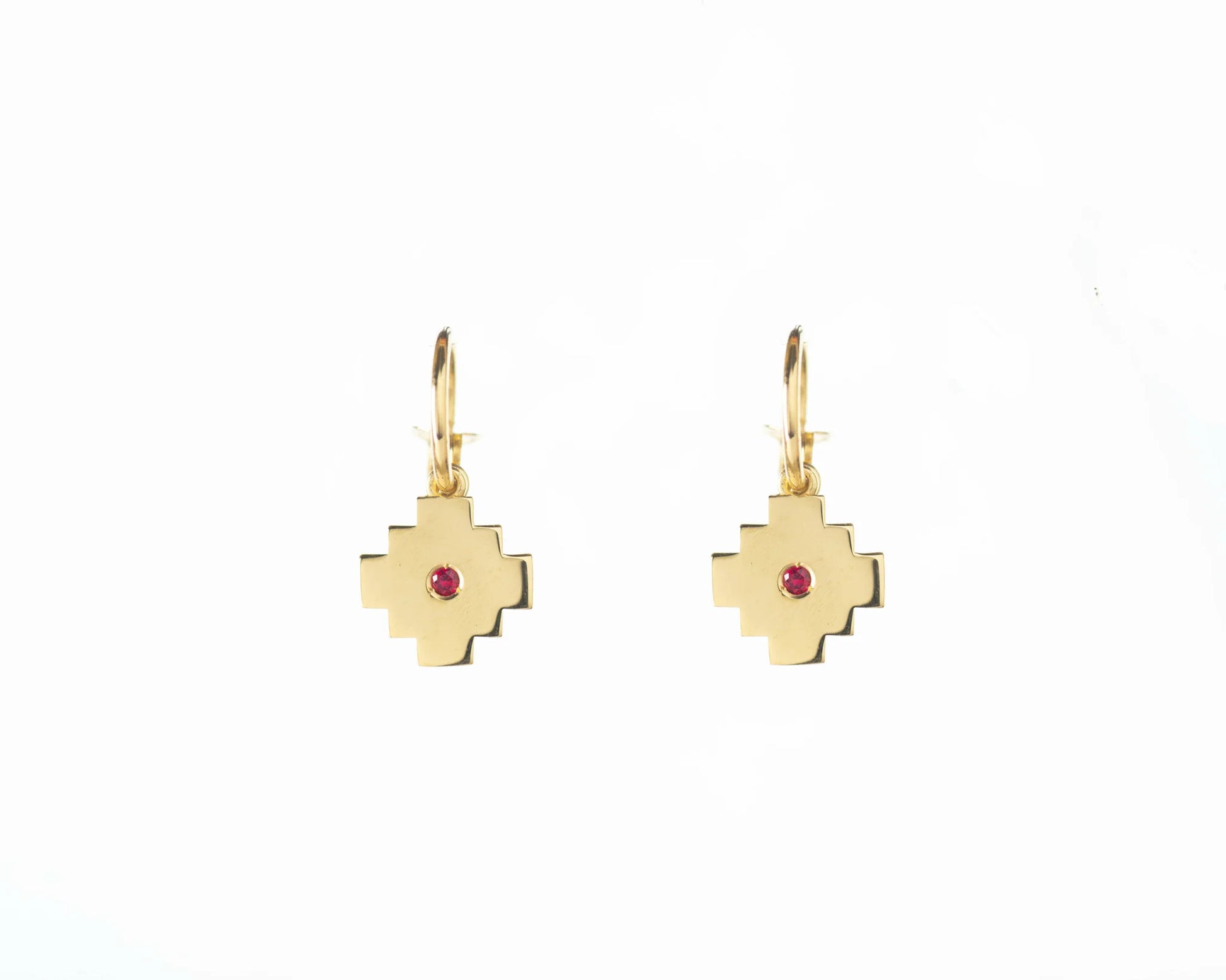 Pendiente con charm de chakana en Plata 925 chapado en oro de 18k y circonitas talla brillante de color rojo rubí. Dimensiones: 1. Aro: 12mm. 2. Cruz: 12mm.