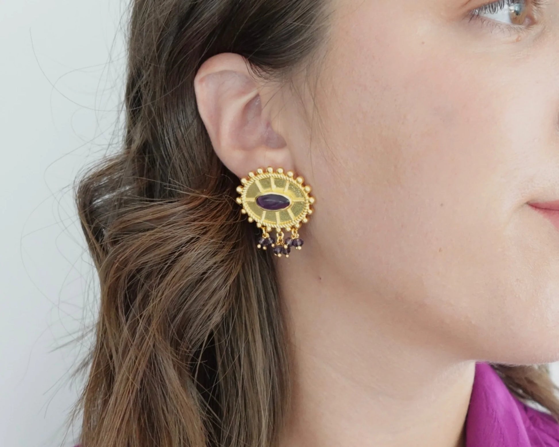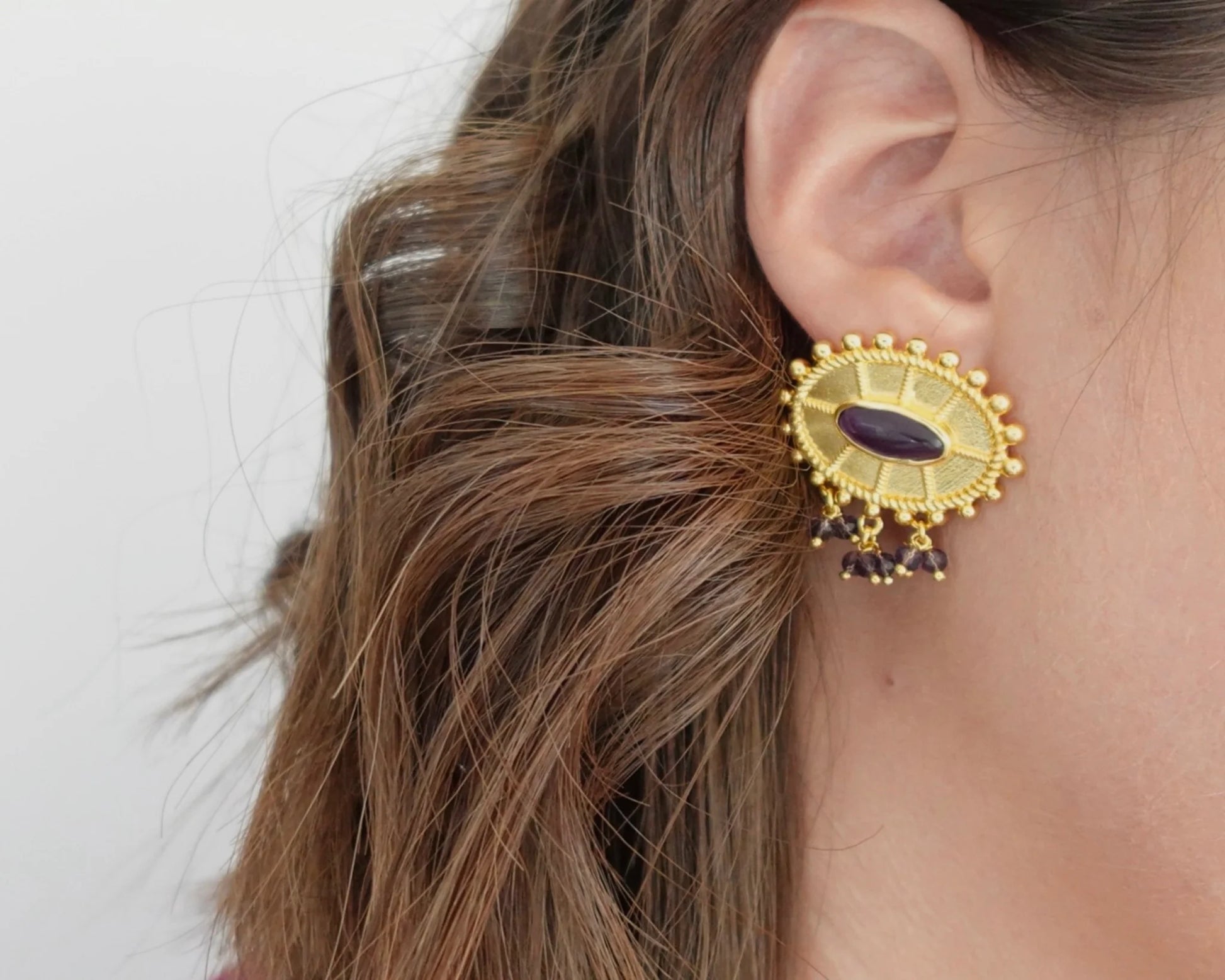 Pendientes de bronce con baño de oro de 18k y piedra amatista. Cierre: tuerca. Mineral: 13x6mm y 3mm. Medida: 32x34mm.
