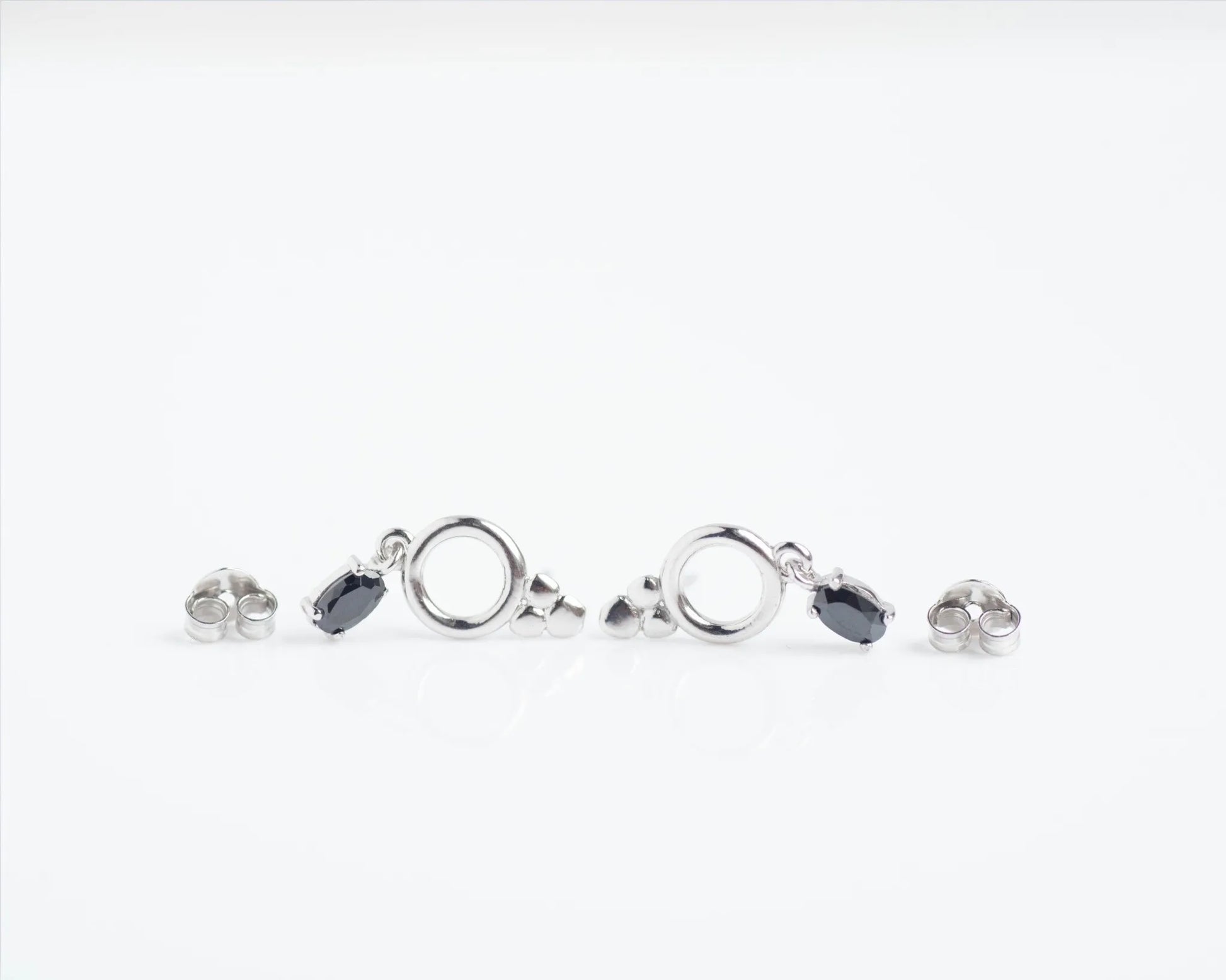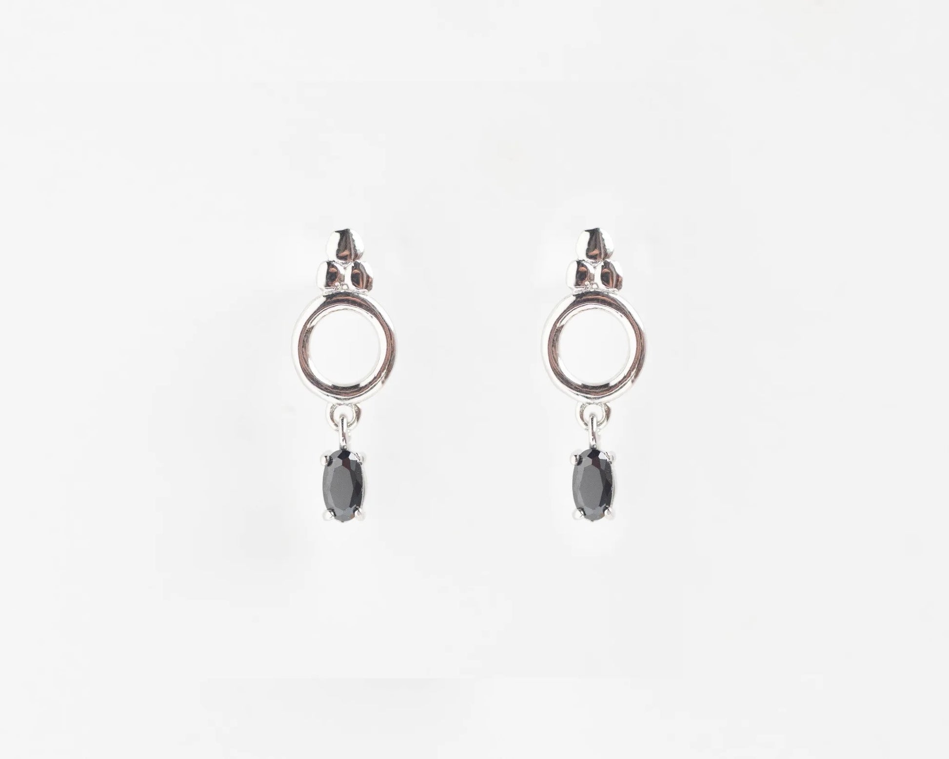 Pendientes en Plata 925 con baño de rodio blanco y circonita en color negro talla oval y engaste en garra. Dimensiones: 1. Pendiente: 20mm x 8mm. 2. Circonita: 5mm x 3mm.