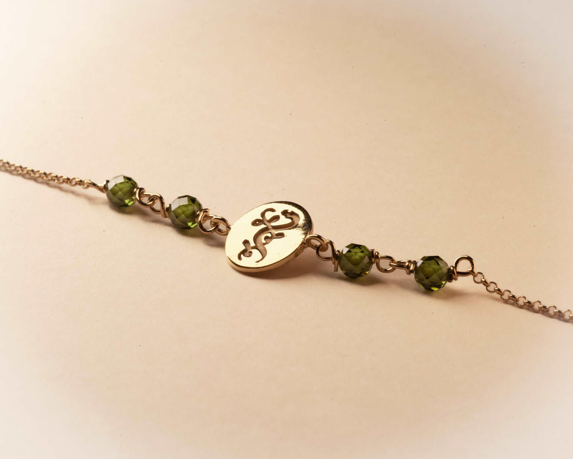Pulsera en Plata 925 chapada en oro de 18k y circonitas facetadas en color verde olivina. Dimensiones: largo de la pulsera 17cm y alargador de 3cm. Medalla de 10mm x 12mm.